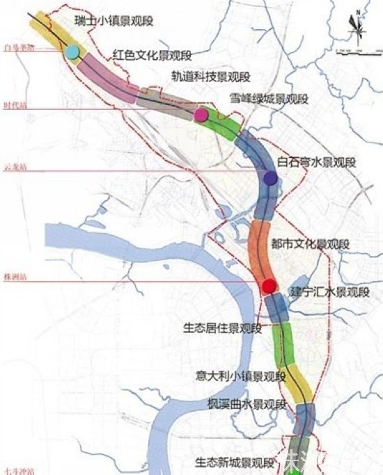 根据《方案》,城际铁路沿线区域将分为“五大片区”、“十大主题功能区域”,并形成11个主题景观段。分别为:瑞士小城、红色文化、轨道科技城、雪峰绿城、白石湾水、都市文化、建宁汇水、生态居住、意大利小镇、枫溪曲水和生态绿城景观段。